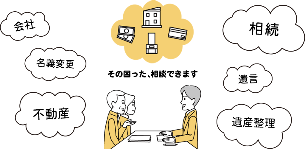 司法書士業務のメインとなる登記手続きはもちろん、相続、生前贈与、遺言作成、成年後見、任意後見、不動産登記、会社設立は当事務所におまかせください。